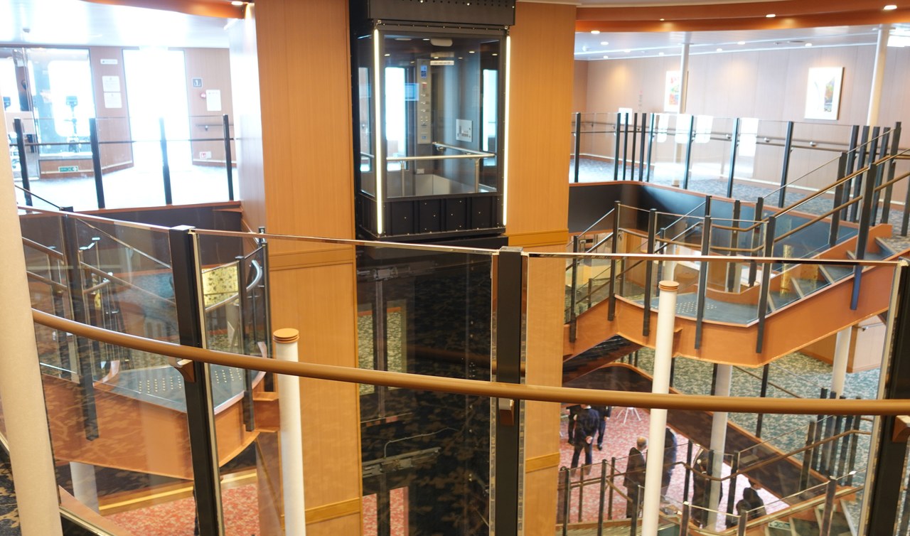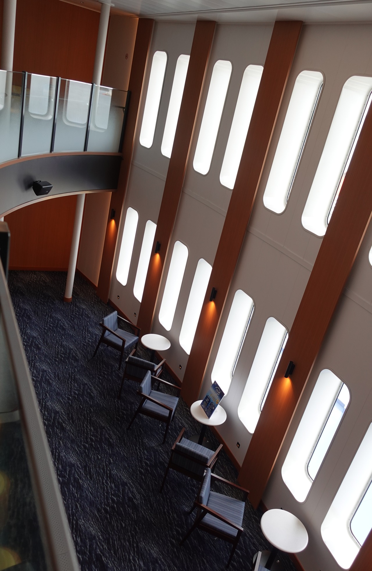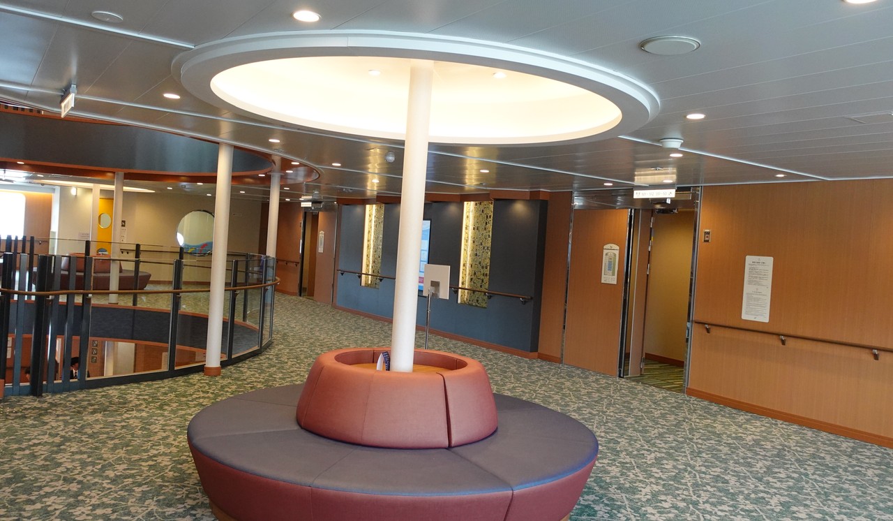 フェリー「けやき」に一歩足を踏み入れると、4階から7階までを一挙にぶち抜いた、シースルーエレベーター付き吹き抜けフロアの解放感に驚く。