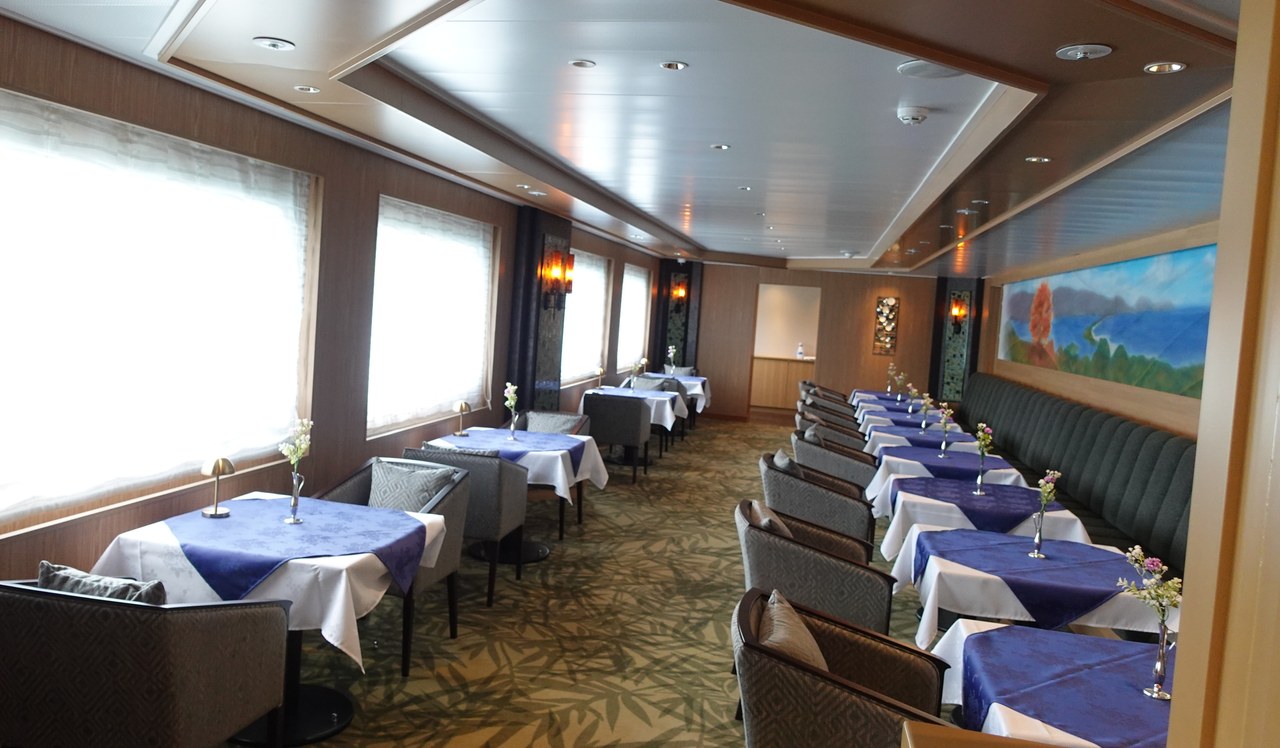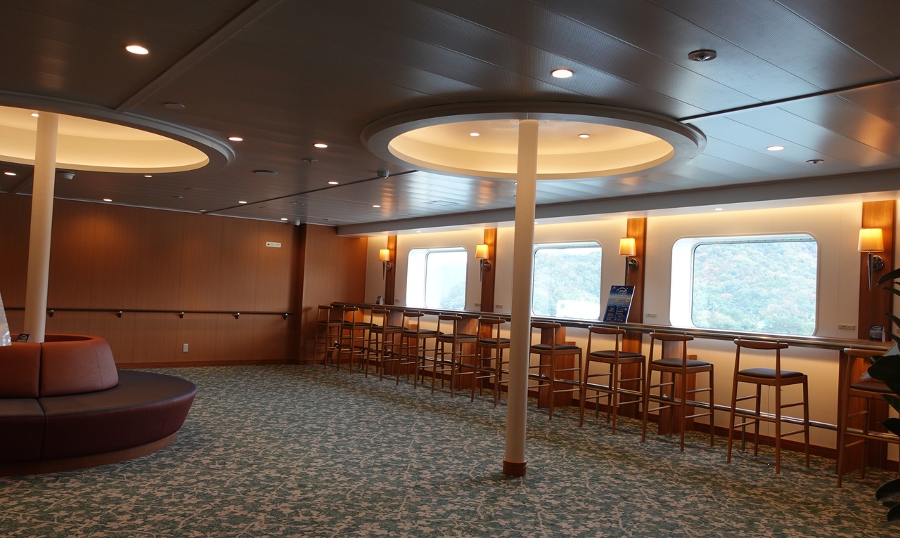 「海の京都」と呼ばれる日本海側随一の良好・舞鶴に発着しているだけあって、船内のデザインは「京都の海」をイメージしたシックなもの。海を眺めながらひと息つける共有スぺ―スも各種あり、船が進む前方を眺める「フォワードサロン・白竜」も、宮津市の「白竜の滝」から名付けられただけあって、滝のような落差の2階建てから、色々な角度で海を眺めることができる…長距離フェリーの船内は快適に過ごす工夫がなされ、まさに「海上を動く、ちょっといいホテル」そのものだ。