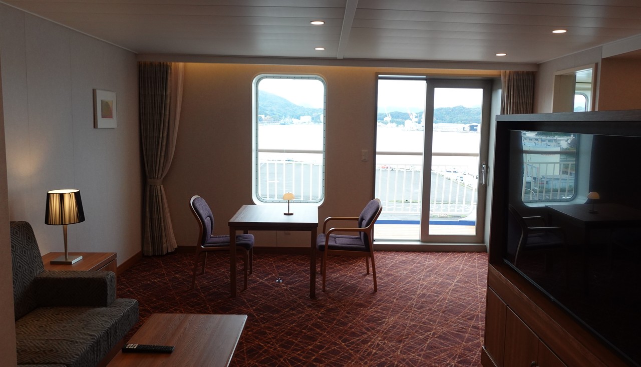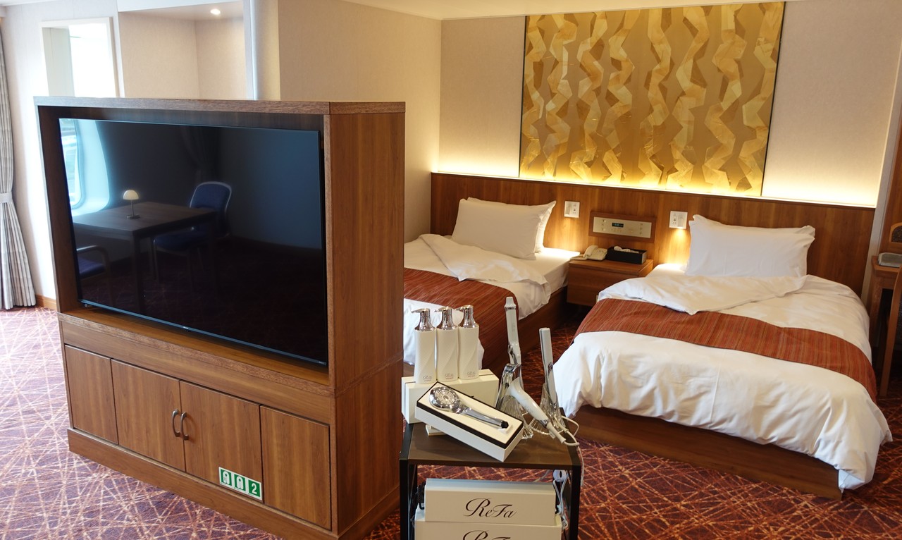 宿泊する部屋にしても、船の面積が限られているがゆえに、昔の「一等室」だとベッドも狭い…ことはない。「けやき」のスイートは海をたっぷり眺められるバルコニーデッキに、専用バス・トイレ・大型モニターに、広々としたベッド。美容機器「ReFa」のドライヤー・シャワーヘッド・バスアイテムをえるとあっては、普通のホテルのスイートルームのサービスと変わらない、贅沢な空間だ。