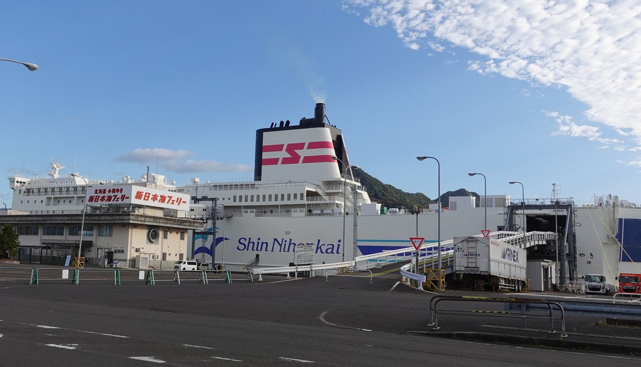 舞鶴・敦賀から日本海を北上して北海道を結ぶ新日本海フェリーは、本州側からは精密機械・機器類の輸送が多く、北海道からは季節の農作物や生乳などが多いという。またコンテナ・シャーシなどの無人航送が4割以上を占めるシーズンも多く、港では系列会社「マリネックス」がトレーラーヘッドでコンテナをフェリーにのせて、先頭の部分だけ降りてきて、また次のコンテナ作業を乗せて…という作業を、延々と繰り返しているので、いちど眺めるのも面白いだろう。