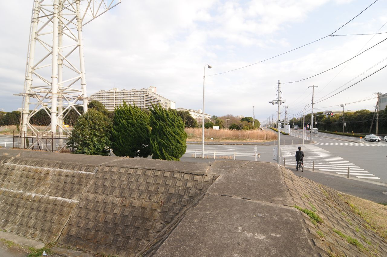 ▲浦安市の沿岸は埋立や干拓によって段階的に造成されたため、陸地に防波堤が存在している(2021年2月撮影)