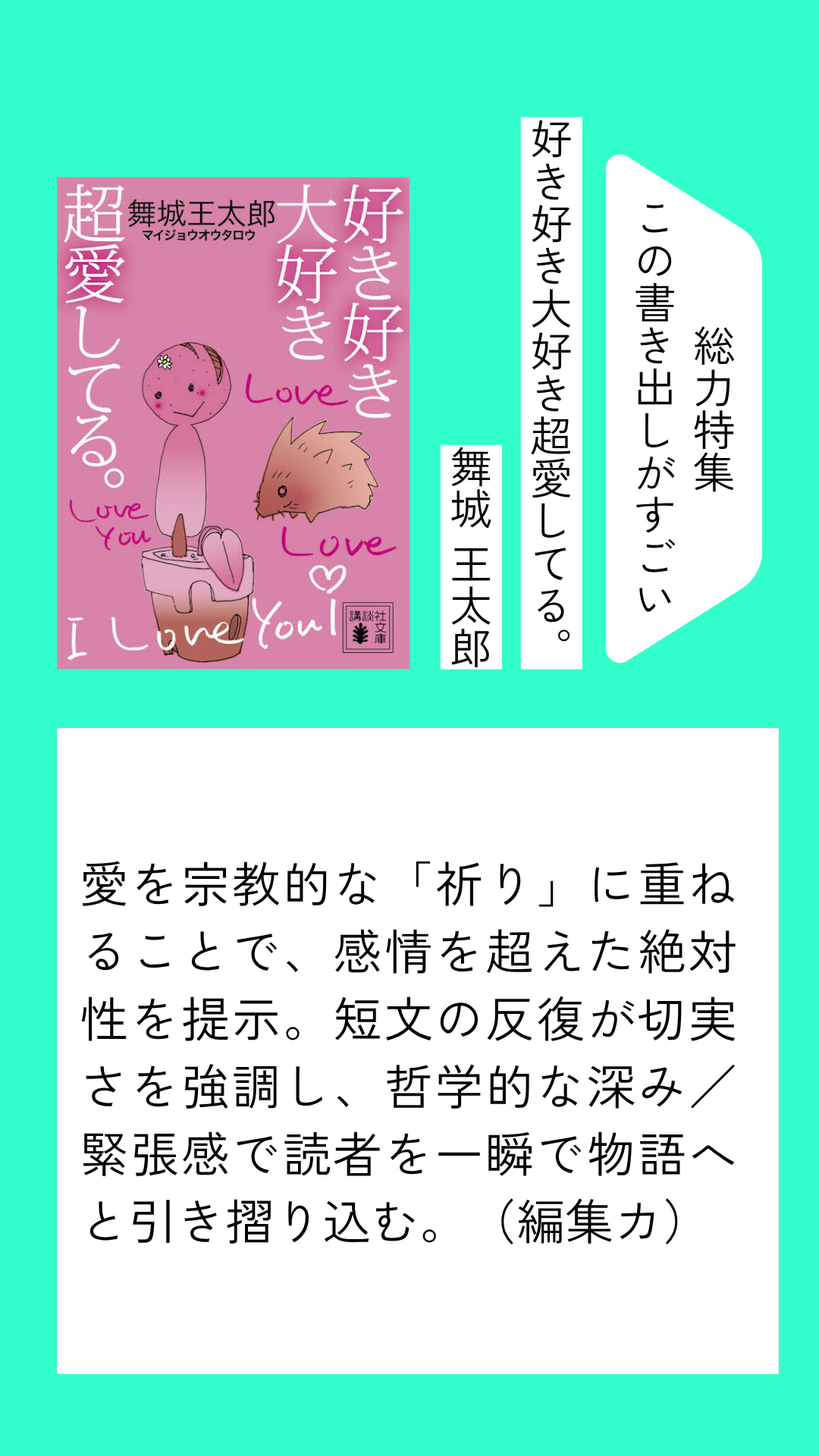 【好き好き大好き超愛してる。】愛は祈りだ。僕は祈る。僕の好きな人たちに皆そろって幸せになってほしい。それぞれの願いを叶えてほしい。温かい場所で、あるいは涼しい場所で、とにかく心地よい場所で、それぞれの好きな人たちに囲まれて楽しく暮らしてほしい。最大の幸福が空から皆に降り注ぐといい。「恋愛」と「小説」をめぐる恋愛小説。