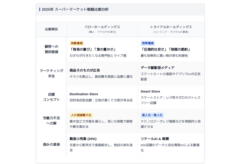 消費者は今後、「週末のハレの日の買い物」にはバローを、「平日の補充買い」にはトライアルを選ぶという形で、明確な使い分け(TPO)を行うことになるだろう。つまり、この両極端な戦略は、単日という短いスパンで見れば顧客を奪い合っているように映るかもしれない。しかし、生活者のライフスタイル全体に落とし込んだ時、それは「奪い合い」ではなく、シーンに応じた「選択肢の提示」へとその意味を変えるのである。