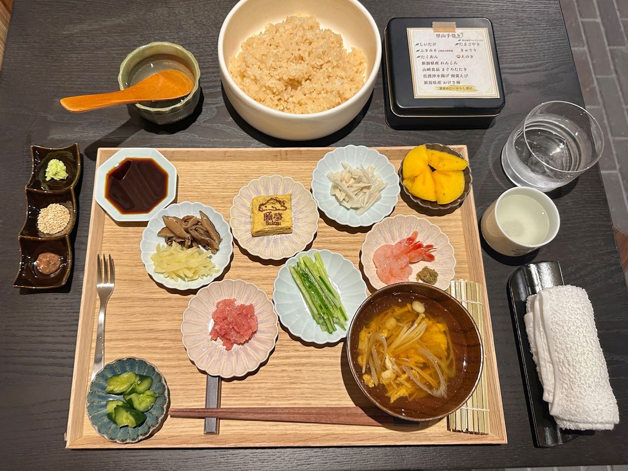 夕食は自身で好きな具材を組み合わせて手巻きする「里山手巻き寿司」をいただくことができ、フリーフローの日本酒と共に楽しむことができました。サウナだけでなく、お酒好きな方にもおすすめしたい宿です。