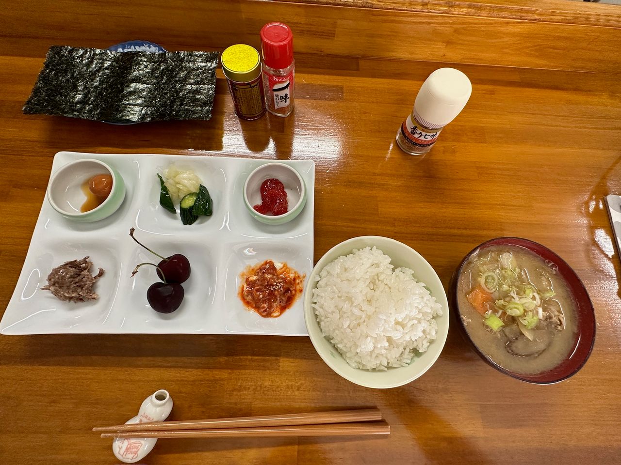 素泊まりですが、食材の持ち込みが可能なので鳴子御殿湯駅周辺の飲食店でお弁当やお惣菜を購入して宿で食べることができます。翌朝の朝食は、宿のすぐ目の前にある「菅原分店765」という朝から営業している居酒屋にて、お米や海苔にもこだわったおにぎりセットやおにぎりの具定食のようなメニューをいただくのもおすすめです。