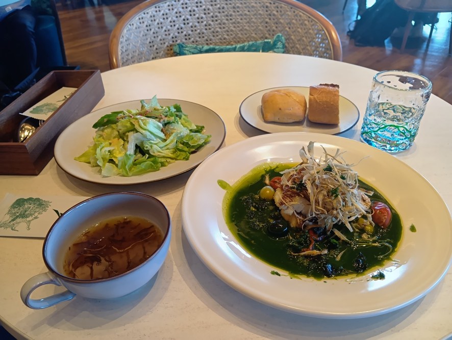 パーク内に1カ所しかない屋内レストランに入ったのは午前11時過ぎ。受付には10名ほどが並んでいた。早めのランチだったこともあるのだろう。5分も経たない内に案内してくれた。店内の席は半分くらい空いていた。私は「アクアパッツァ~本日のアイランドフィッシュ~(税込2800円)」を注文。インスタ映えしそうな盛り付けで、味も悪くない。
