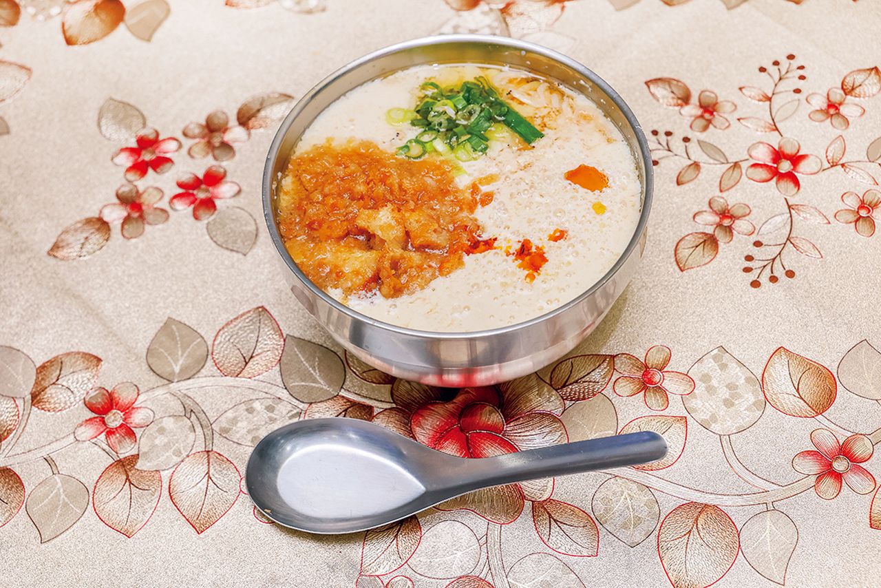 1949年創業の人気朝食店でいただく、濃厚な豆乳のスープ。塩と酢のバランスが絶妙で、大きな豆腐が食べ応え満点! オレンジピールの入った豆乳パンもおすすめです。