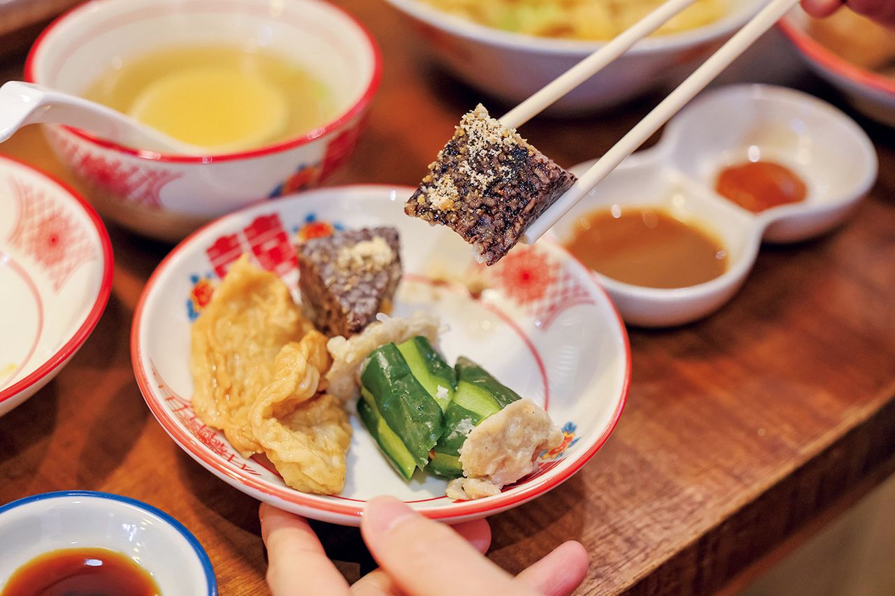 もち米と豚の血を固めた、台湾のソウルフードのひとつ。見た目以上にクセがなく食べやすい! こちらのお店にはきゅうりやりんごもおでんの具として入っています。優しい出汁がしみていて、意外な美味しさなのです。