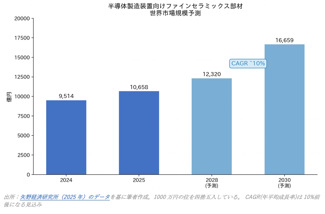 矢野経済研究所の調査によれば、半導体製造装置向けファインセラミックス部材の世界市場は2024年に約9,500億円規模に達し、2030年には1兆6,600億円を超える見通しだ。年平均成長率は約10%。半導体市場全体の成長率を上回るペースで、「装置を支える素材」の市場が膨張しているのである。