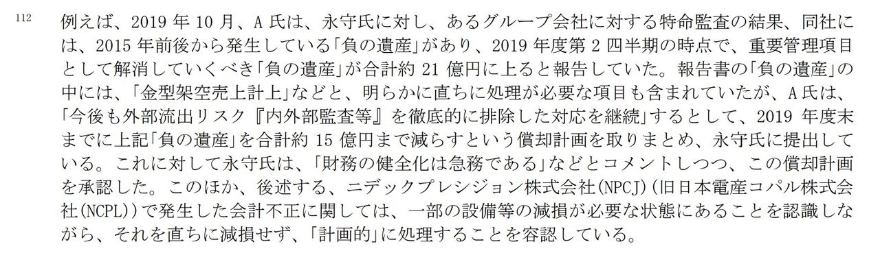 調査報告書によれば、「永守氏も、A氏からの報告を通じて、本来であれば直ちに是正が必要な問題を計画的に処理する例があることを把握していた」とされる。その具体例として、注釈「112」には次のような記述がある(画像)。