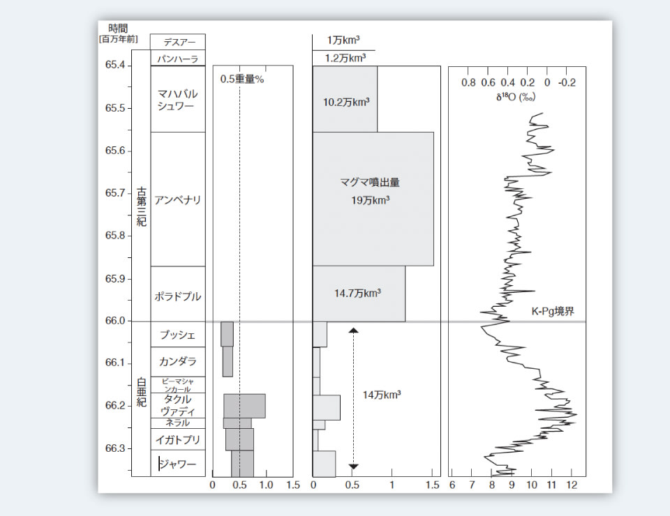 最もマグマの噴出率の高いアンベナリ層の噴火はK-Pg境界から15万年以内に開始しており、その後、30万年間にわたり断続的に噴火を継続しました。