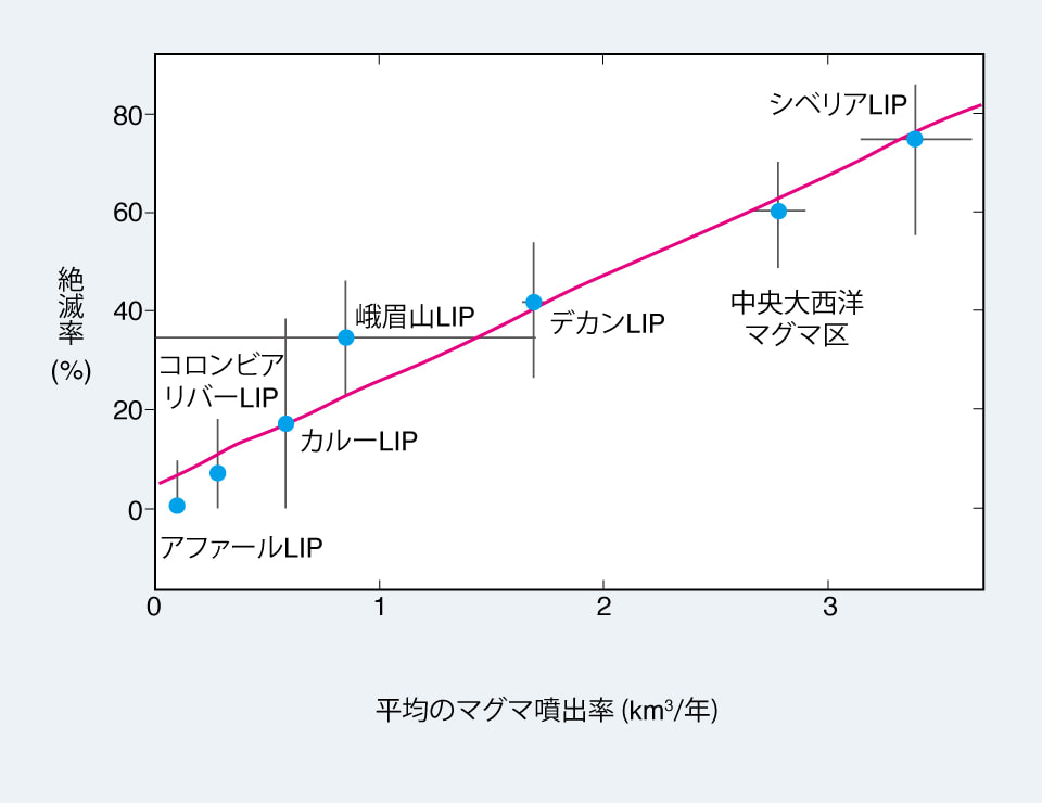 まずは、白亜紀末以外の大量絶滅の主因はLIPの活動であることを前提とした場合について考えていきます。過去のLIP活動と大量絶滅との関係を調べた結果、多量のマグマが一時期に噴火したほうが環境へあたえるインパクトが強く、絶滅率が高かったことがわかりました。これを表したのが図「生物の絶滅率とマグマ噴出率との関係」です。