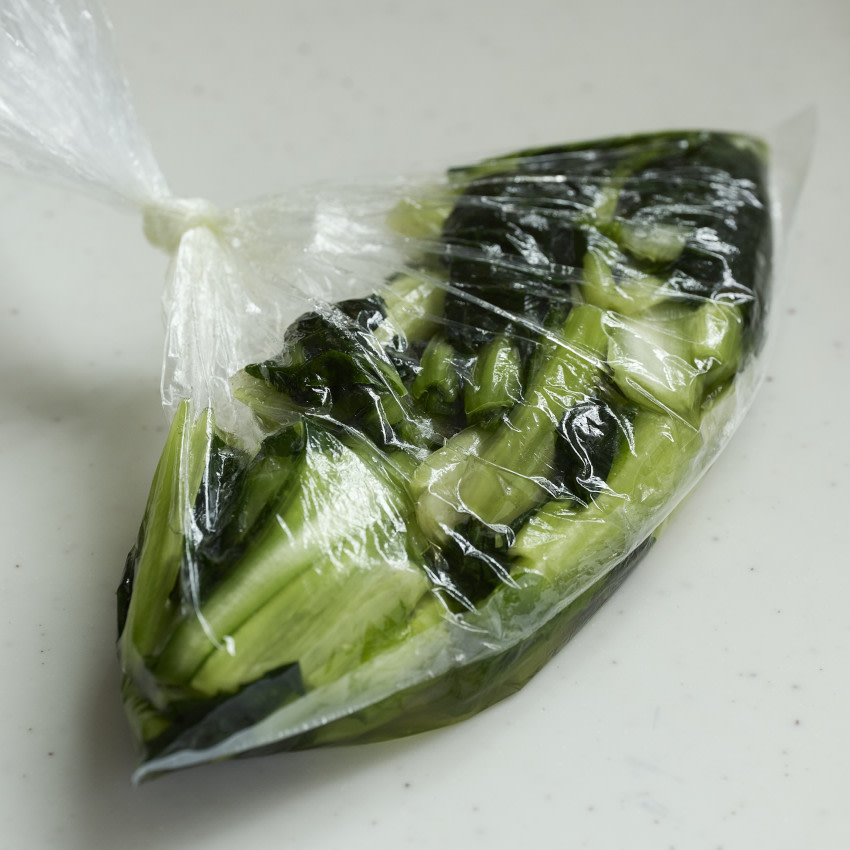 3 押さえつけるようにして空気を抜いて口を閉じ、軽くもむ。1~2時間後から食べられる。使うたびに空気を抜いて口を閉じ、冷蔵庫で保存する。