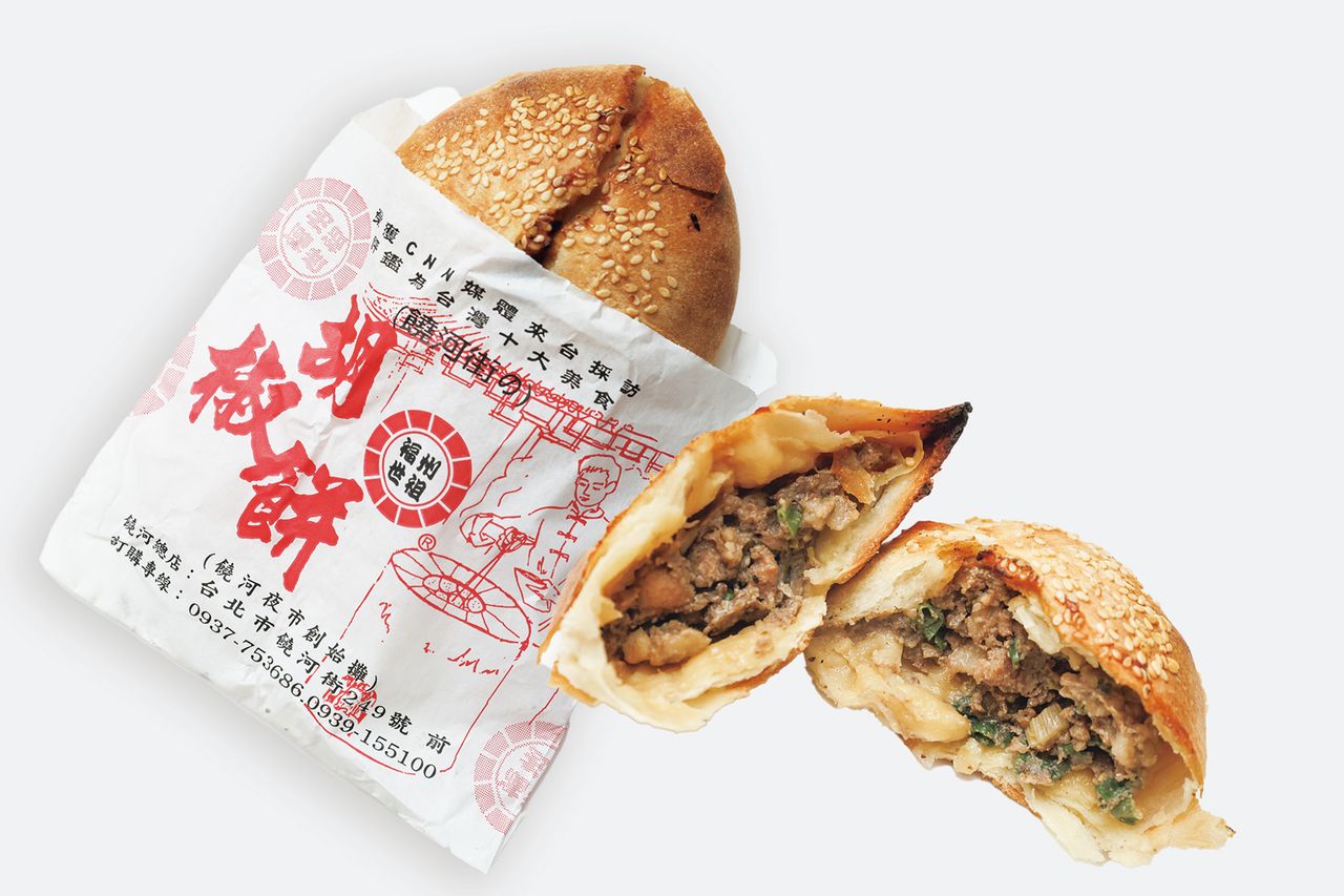 胡椒餅の大人気店で、夜市の門前にあるこちらの本店には行列も。たっぷり入ったスパイシーなひき肉やネギと、サクサクの生地が美味。具は豚肉と牛肉からお好みで。