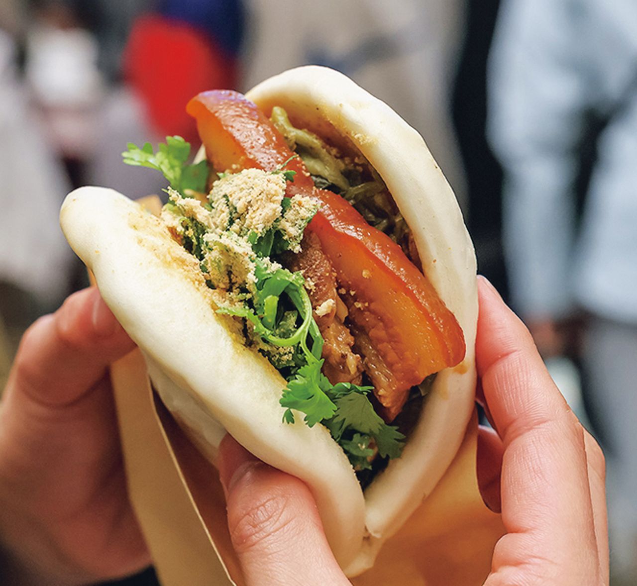 やわらかい豚の角煮と、ふわふわのパンがマッチした“台湾式バーガー“もぜひ食べてほしいメニュー。甘めのピーナッツパウダーがアクセントになっている。