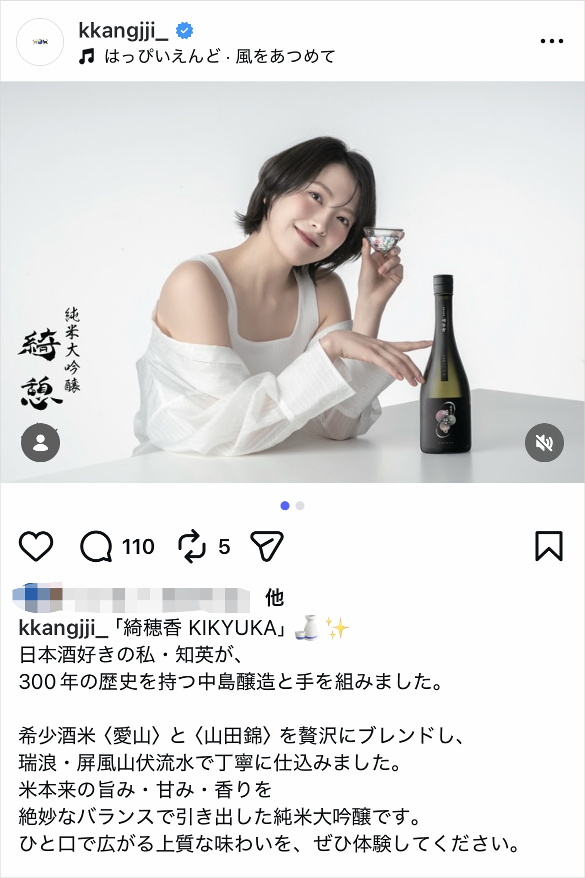 2025年に、日本の酒造会社とタッグを組んで「純米大吟醸 <綺憩香(KIKYUKA)>」をプロデュースした知英さん。味わいはもちろん、ボトルにもこだわりのあるオシャレな日本酒が完成した。