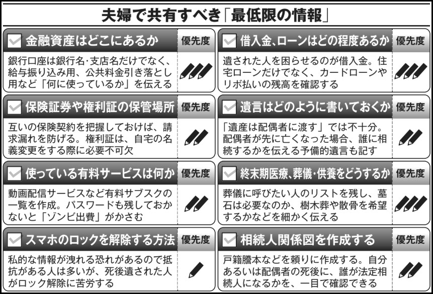 書類の書き方に劣らず重要で、書類を書くよりも手軽に始められるのが、夫婦であらかじめさまざまな情報を共有しておくこと。本章では今からふたりで何を話し、残しておけばよいかを見よう。